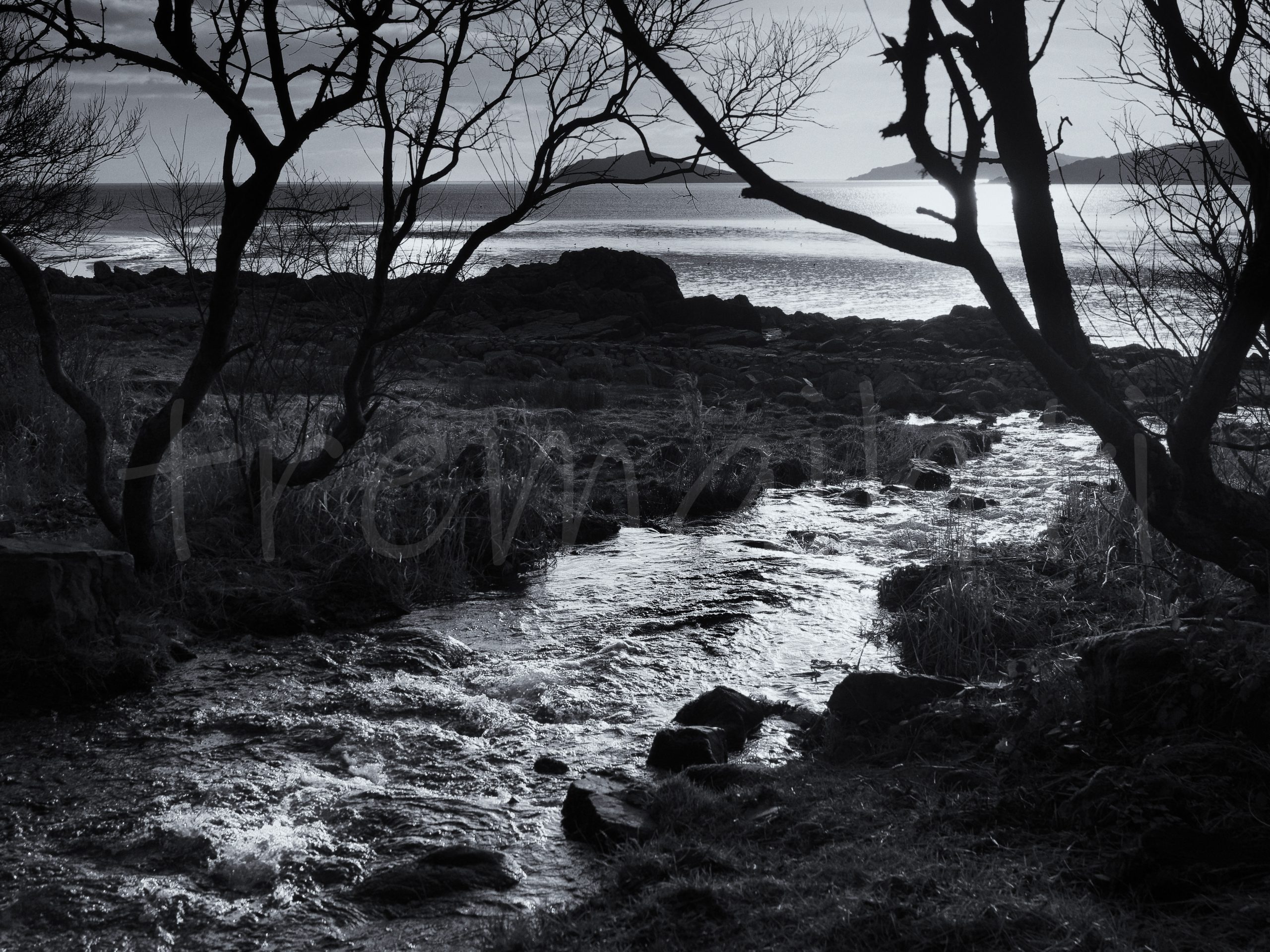 Mill Burn enters the Rough Firth before joining the Solway, Dumfries and Galloway, Scotland. Through the trees we can see Rough Island, which can be reached on foot, when the tide is out, from a point further up the Rough Firth.